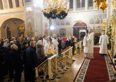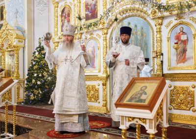 По окончании Литургии Высокопреосвященнейший владыка прочел молитву и вместе с духовенством совершил славление праздника Рождества Христова.