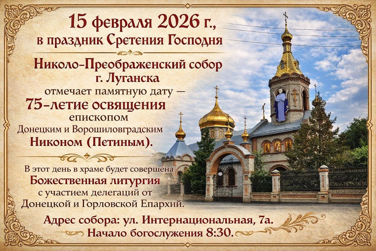 15 февраля, в праздник Сретения Господня, в Николо-Преображенском соборе г. Луганска, состоится торжественное богослужение, посвященное 75-летнему юбилею со дня освящения собора епископом Донецким и Ворошиловградским Никоном (Петиным).