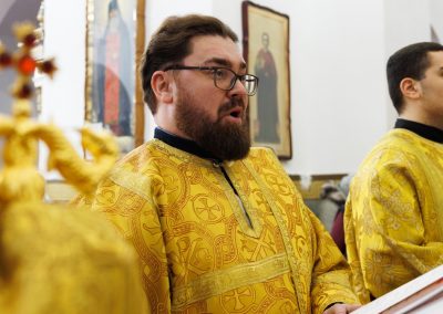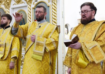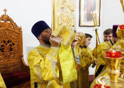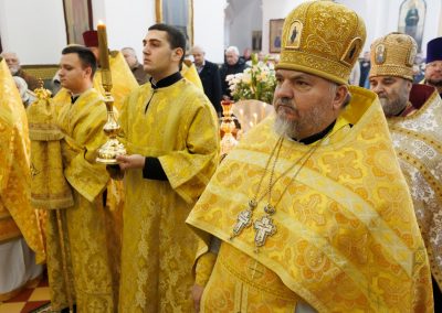 За Литургией Его Высокопреосвященству сослужил секретарь Епархии прот. Андрей Зозуля, благочинный Алчевского округа и настоятель собора прот. Александр Устименко с духовенством благочиния.