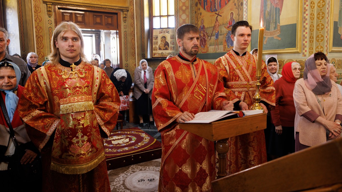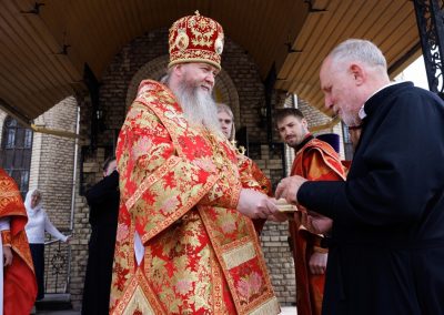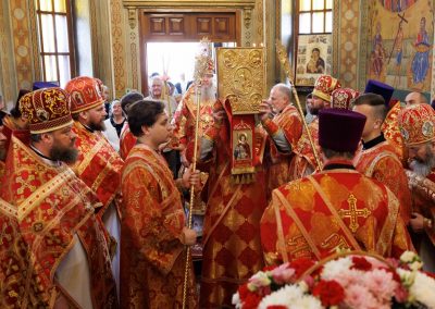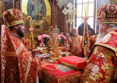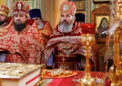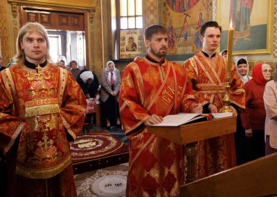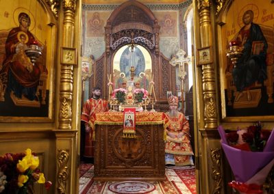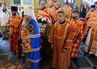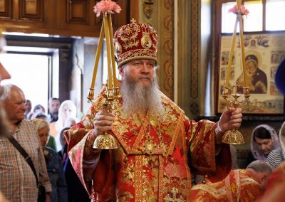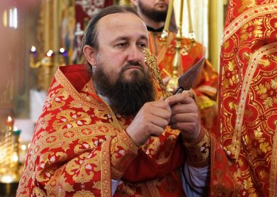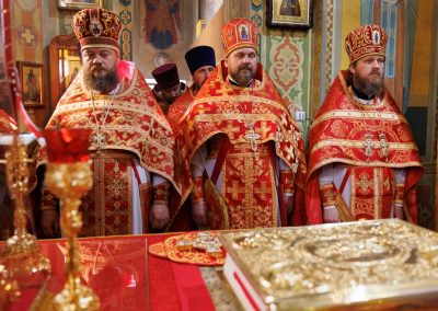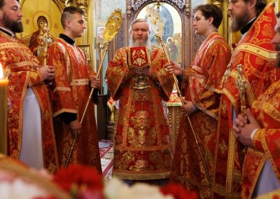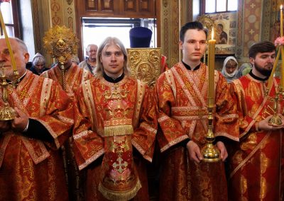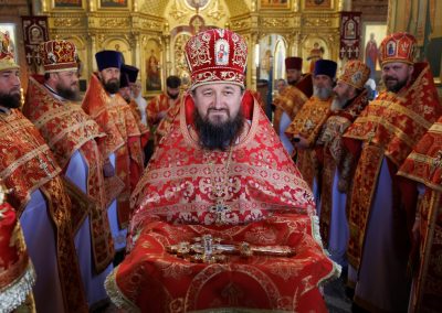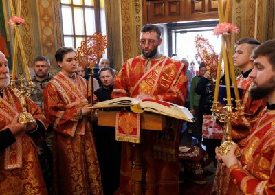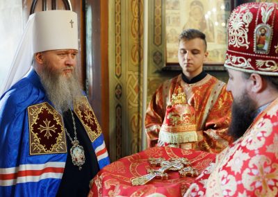 За Божественной Литургией Его Высокопреосвященству сослужил секретарь Епархии прот. Андрей Зозуля, благочинный Новоайдарского округа прот. Евгений Рогозинский, благочинный Перевальского округа прот. Роман Колодка, настоятель храма прот. Иоанн Куманец, а также приглашенное духовенство.
