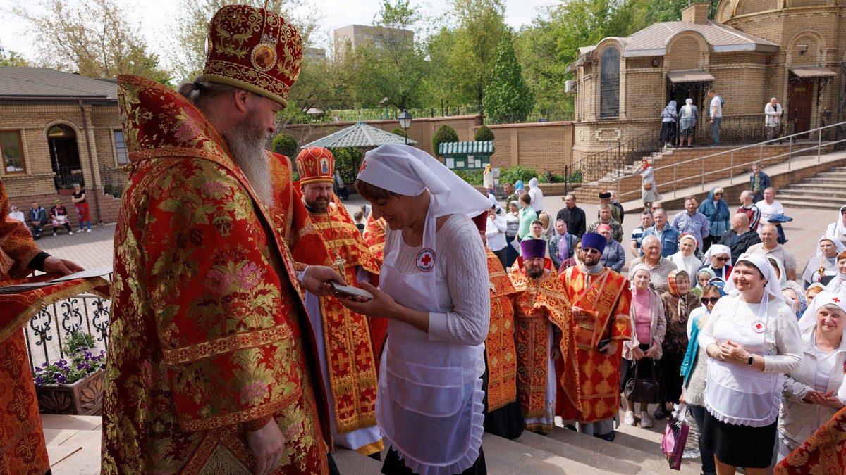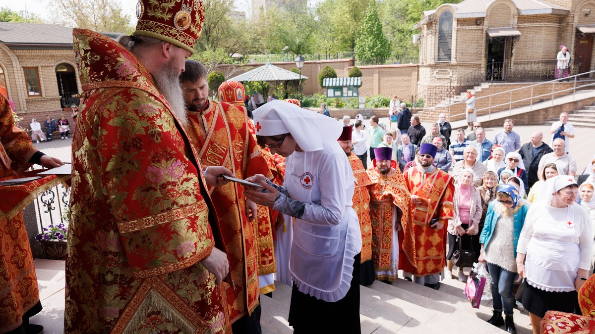Затем, владыка по просьбе Алексея Юрьевича Зарова — главврача больницы святителя Алексия (г.Москва), вручил сестрам милосердия свидетельства об освоении программы профессионального обучения.