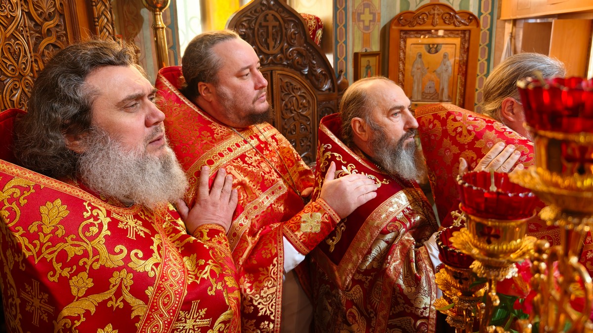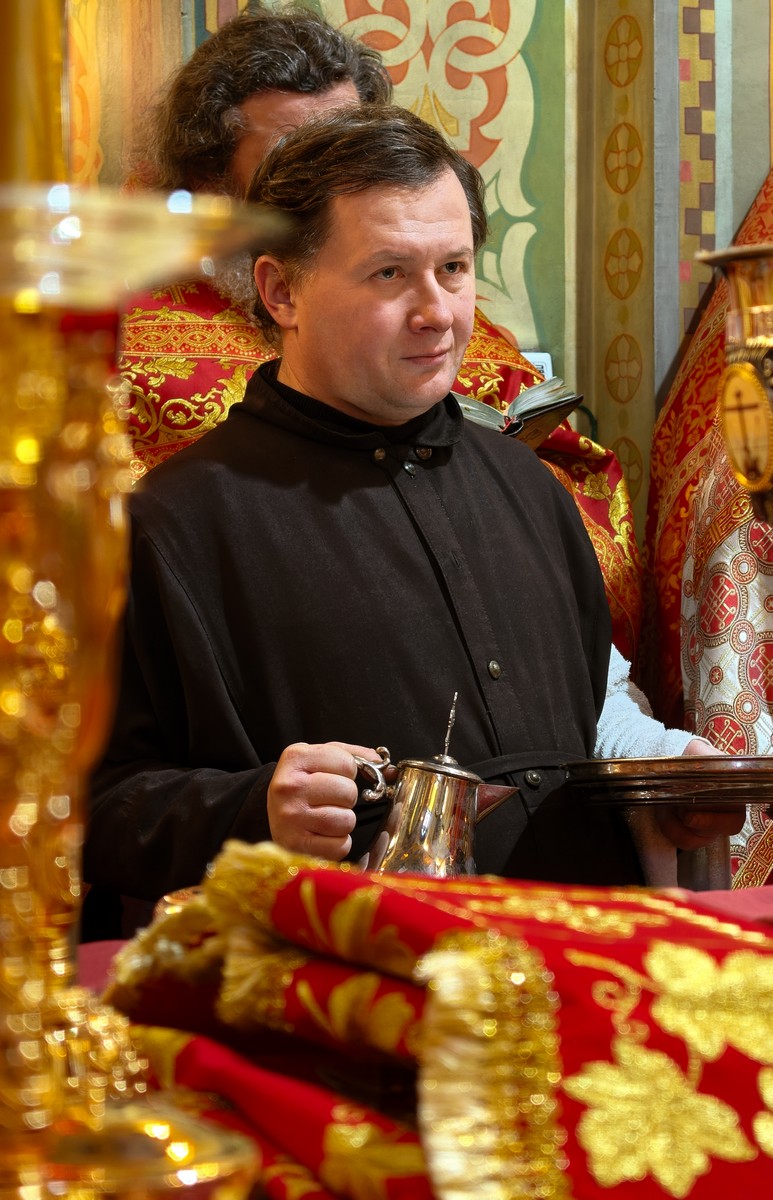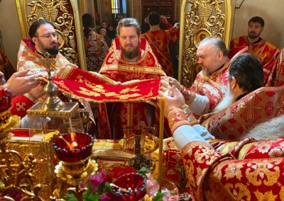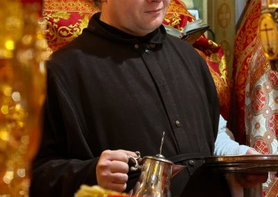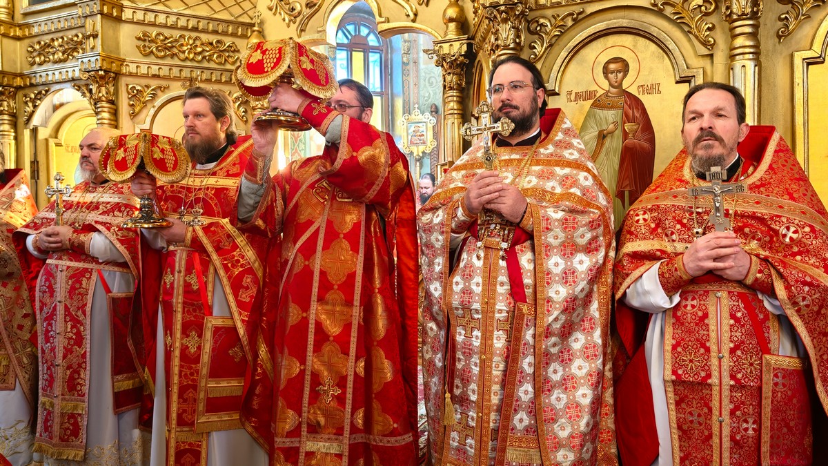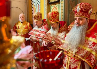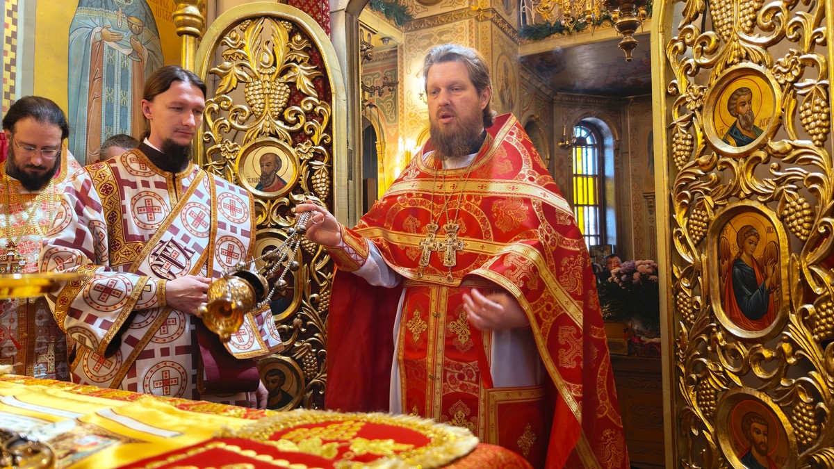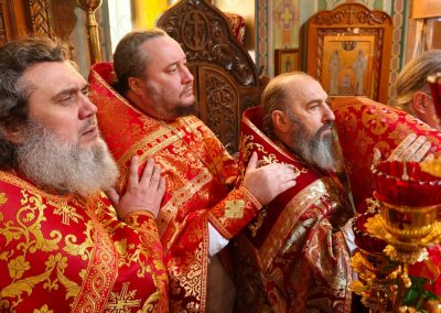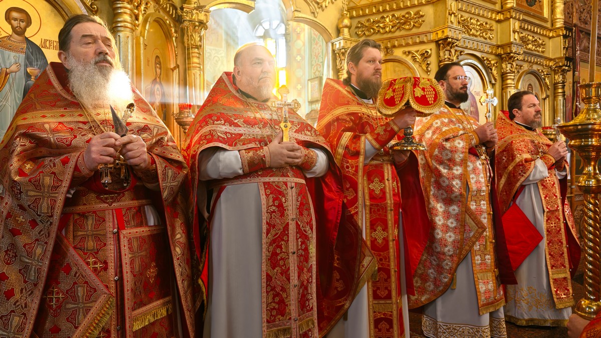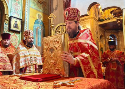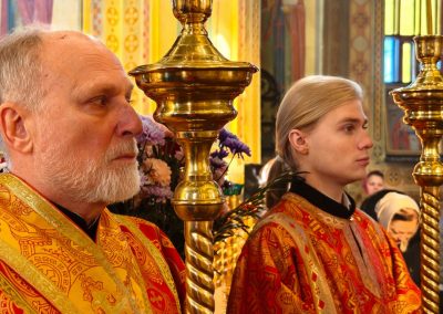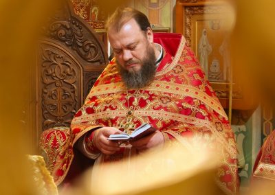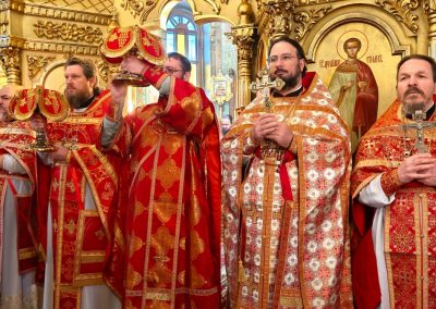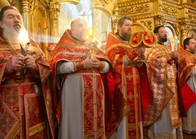 Литургию по благословению Высокопреосвященнейшего Пантелеимона, митрополита Луганского и Алчевского, возглавил секретарь Епархии протоиерей Андрей Зозуля в сослужении благочинного Алчевского округа прот. Александра Устименко, игумена Вознесенского монастыря архим. Иоанна (Сухины), благочинного Ровеньковского церковного округа Ровеньковской Епархии, прот. Григория Устименко, благочинного Михайловского церковного округа Ровеньковской Епархии, прот. Александра Притулы, благочинного Перевальского округа прот. Романа Колодки, настоятеля храма прот. Иоанна Куманец, и приглашенного духовенства.