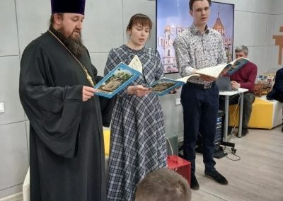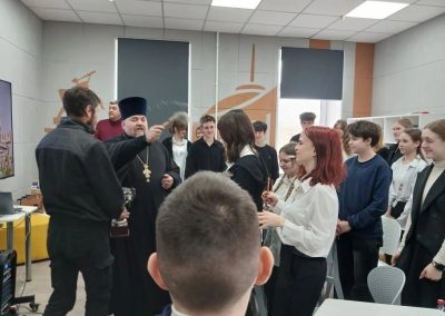 Ребята посмотрели документальный фильм о Деве Марии. В завершении мероприятия отец Александр окропил всех присутствующих святой водой и подарил праздничные церковные свечи на пасху.