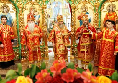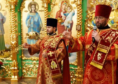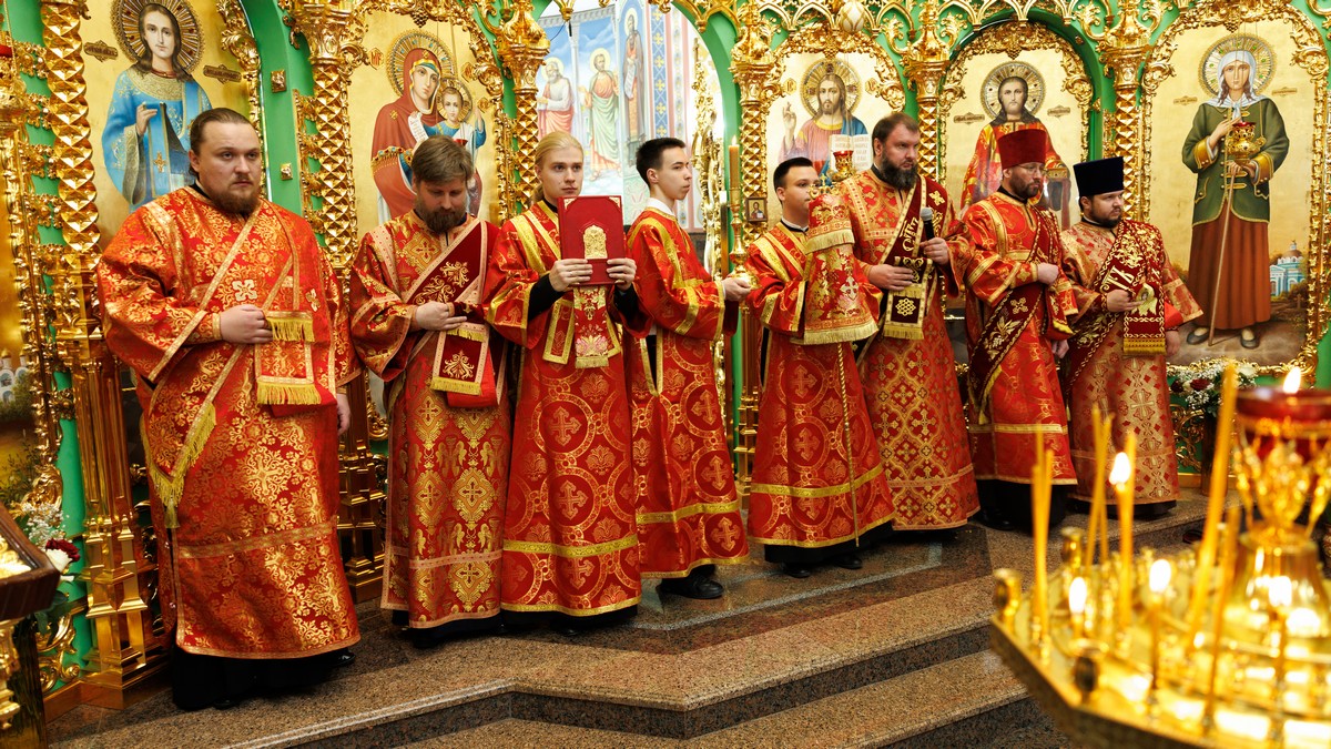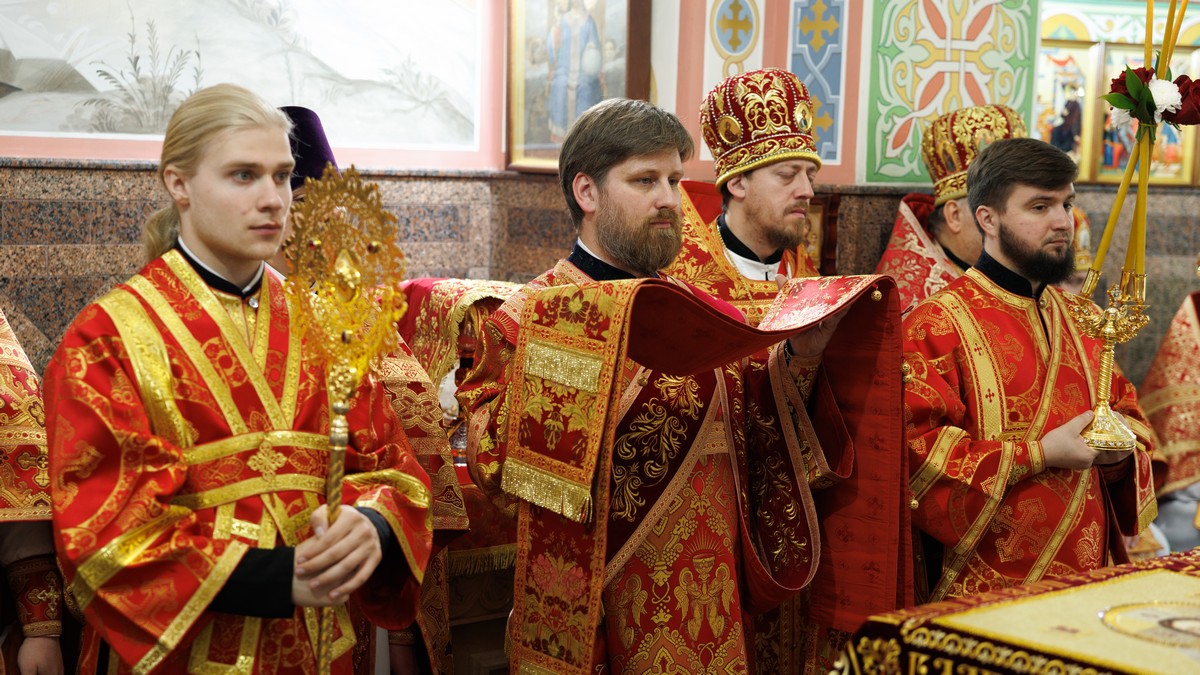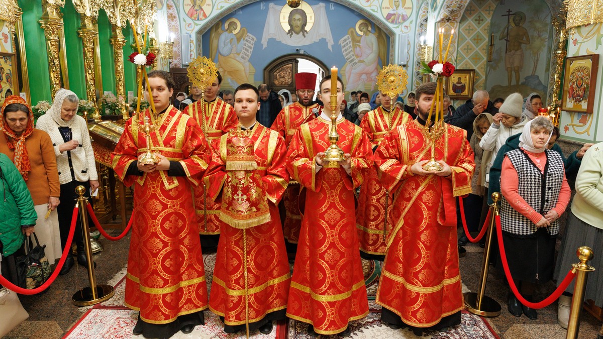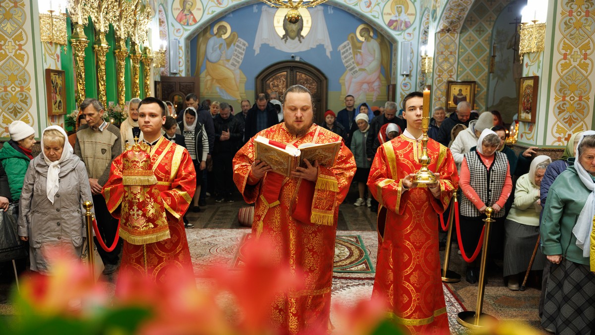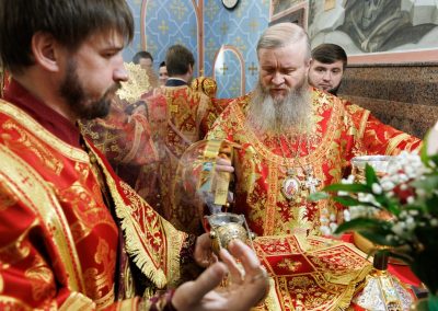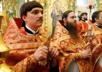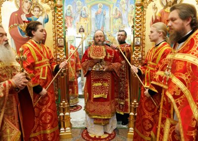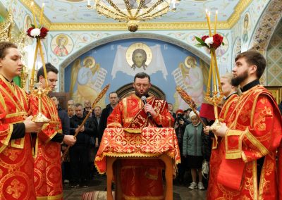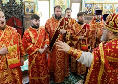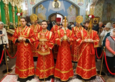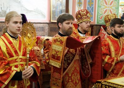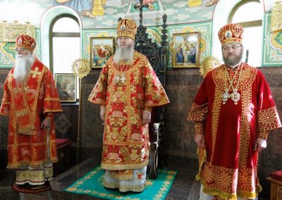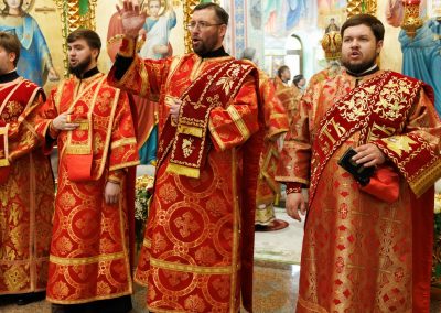 За Литургией Преосвященным архипастырям сослужил секретарь Луганской Епархии прот. Андрей Зозуля, секретарь Ровеньковской Епархии прот. Антоний Устименко, отцы благочинные и настоятель храма прот. Сергий Гутенко.