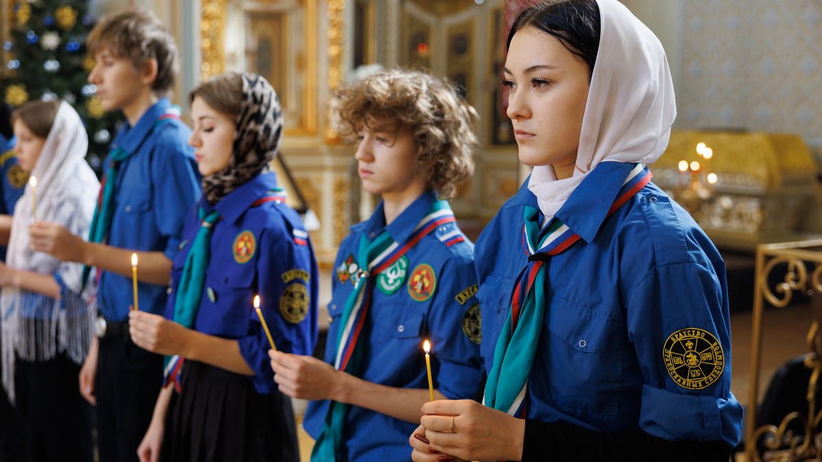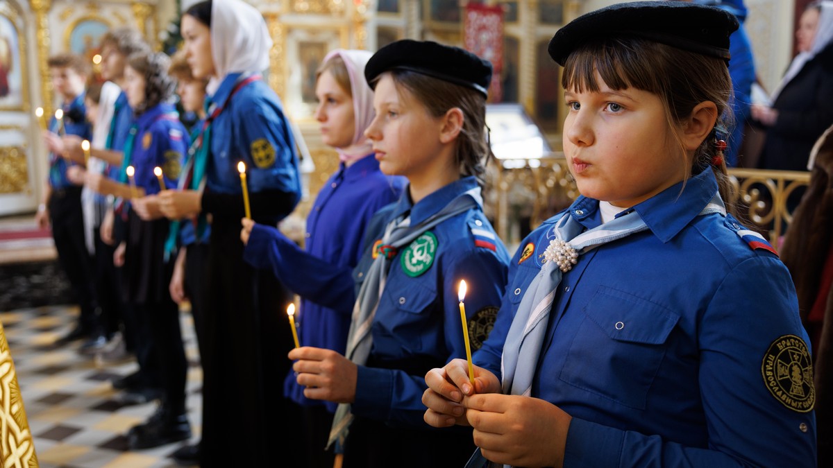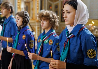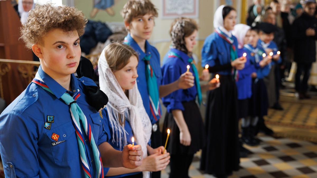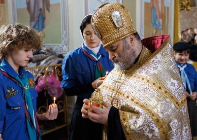 По окончании Литургии в соборе торжественно встретили Благодатный Вифлеемский огонь, принесенный в храм Братством православных следопытов.