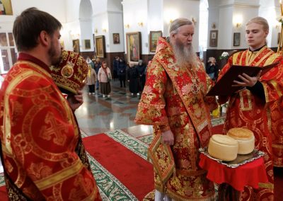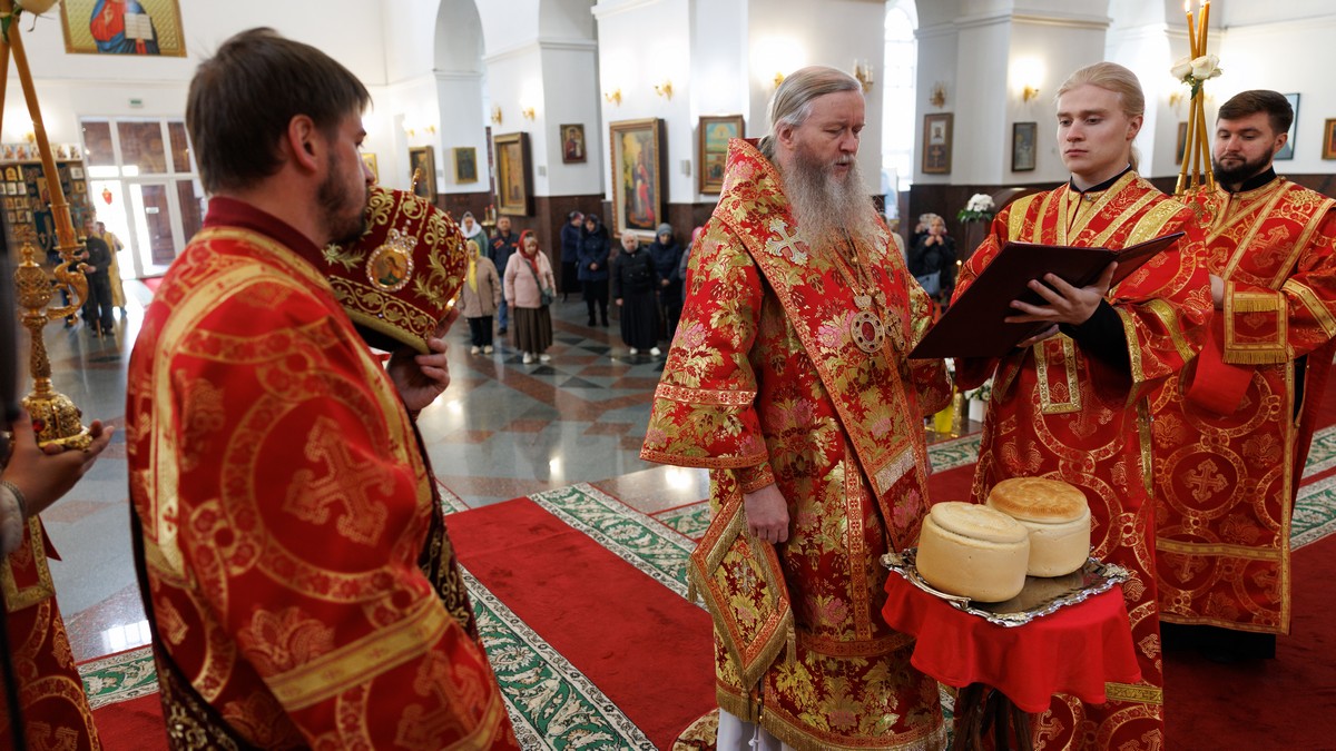 По окончании Литургии владыка прочел молитву на раздробление Артоса.