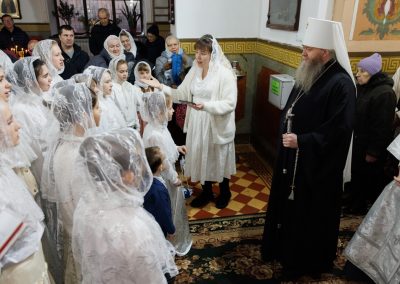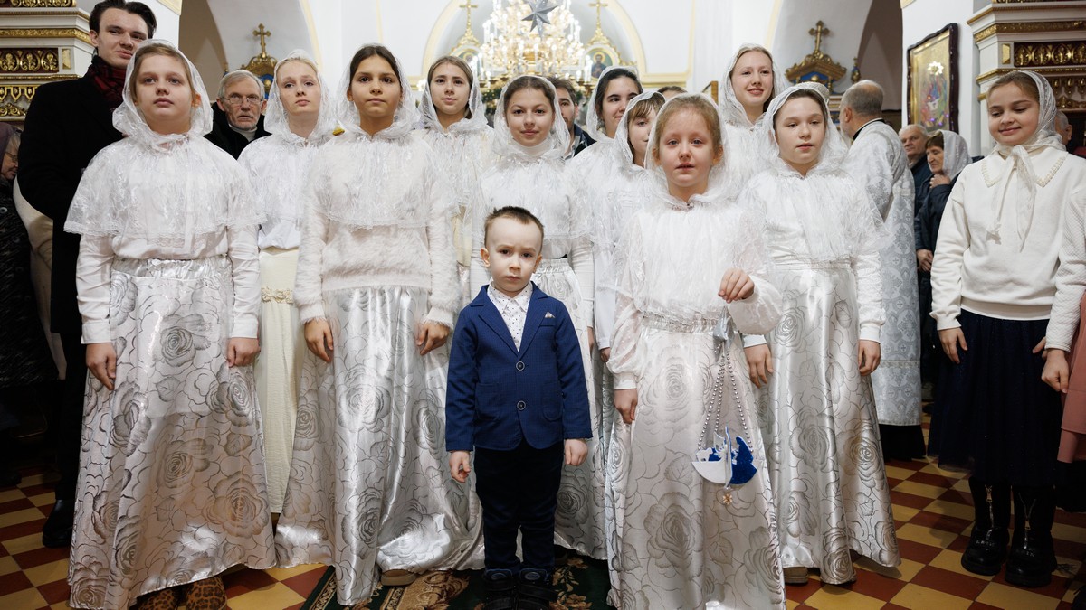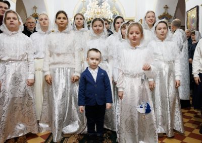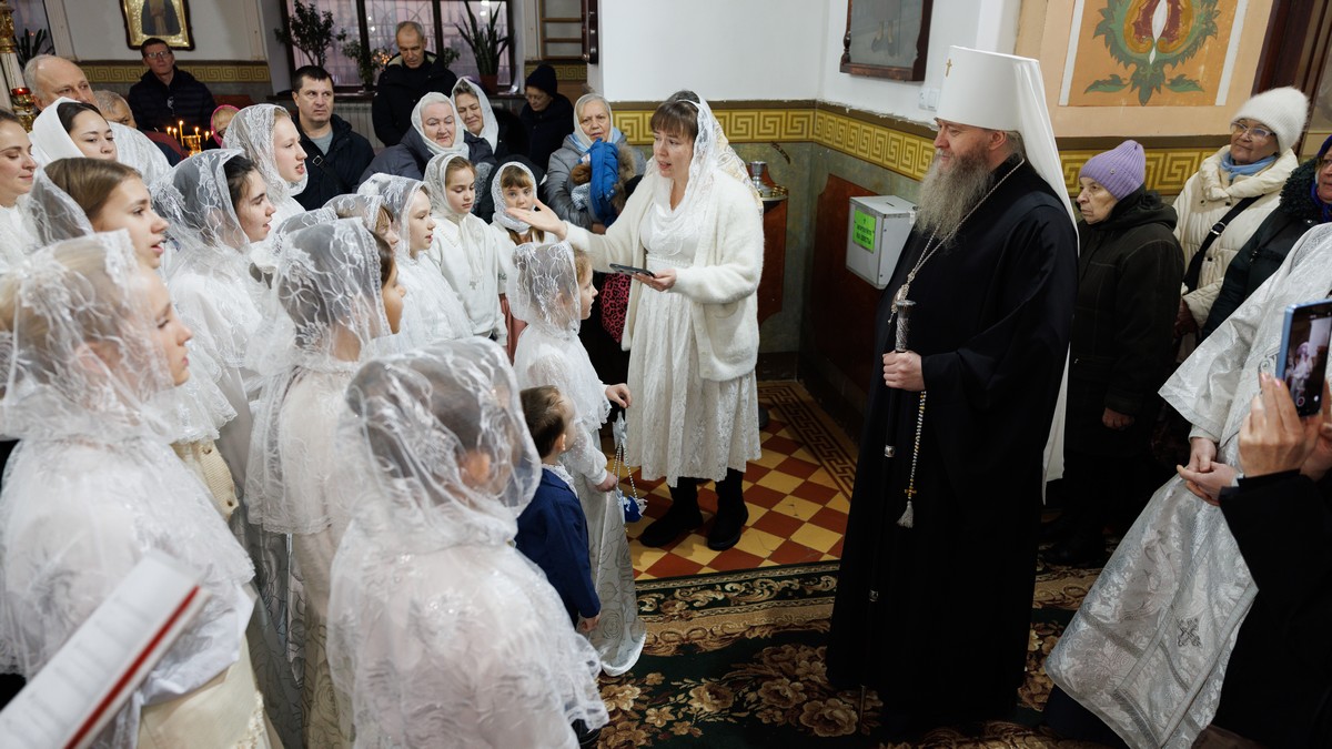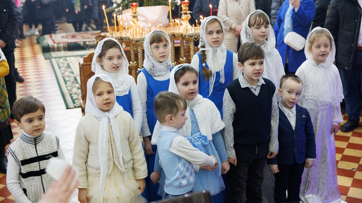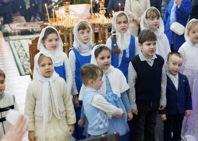 Затем, дети из воскресной школы поздравили владыку, батюшек и прихожан собора Рождественскими колядками.