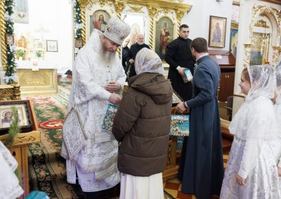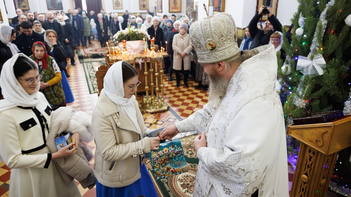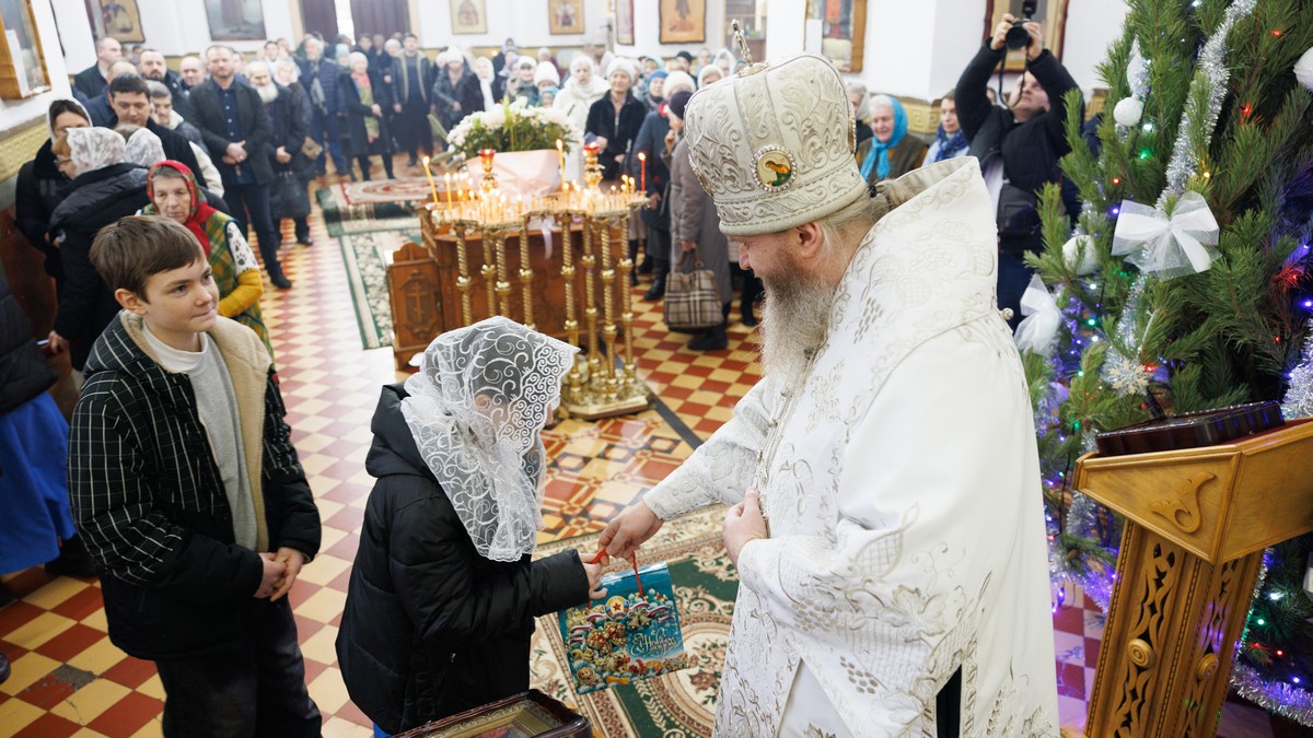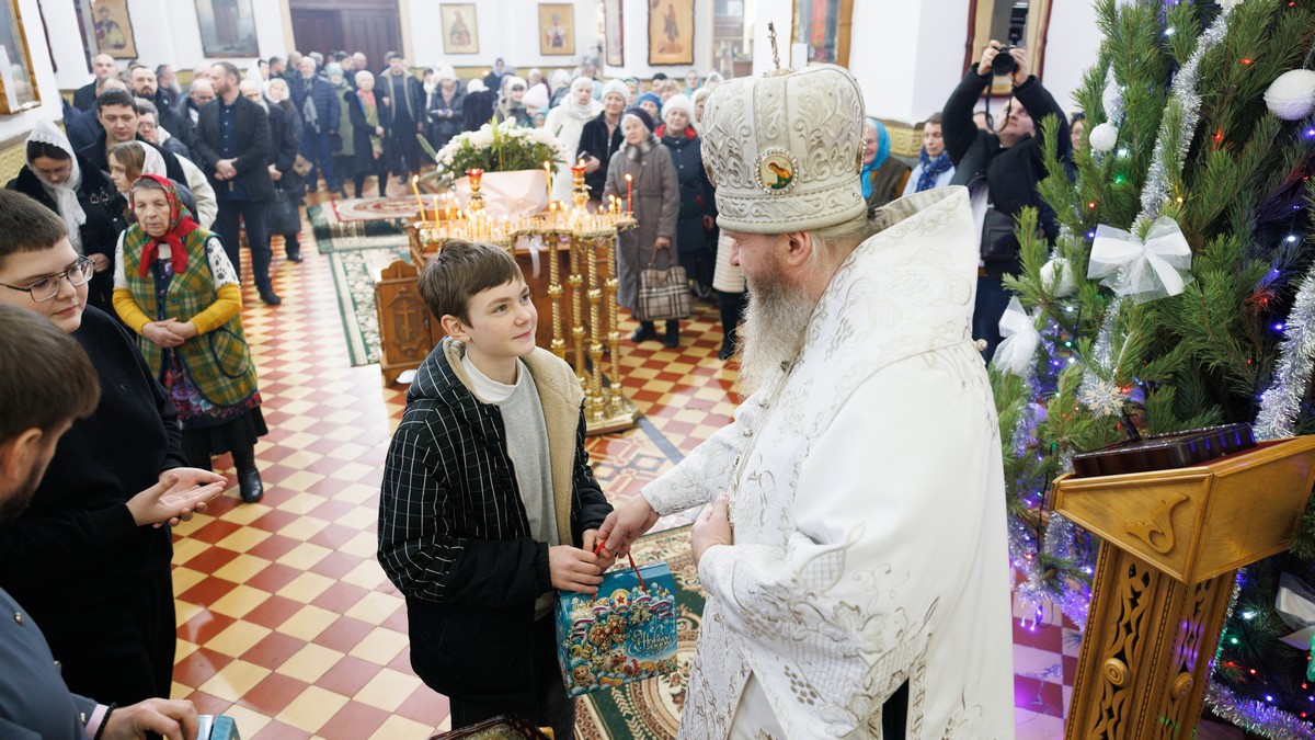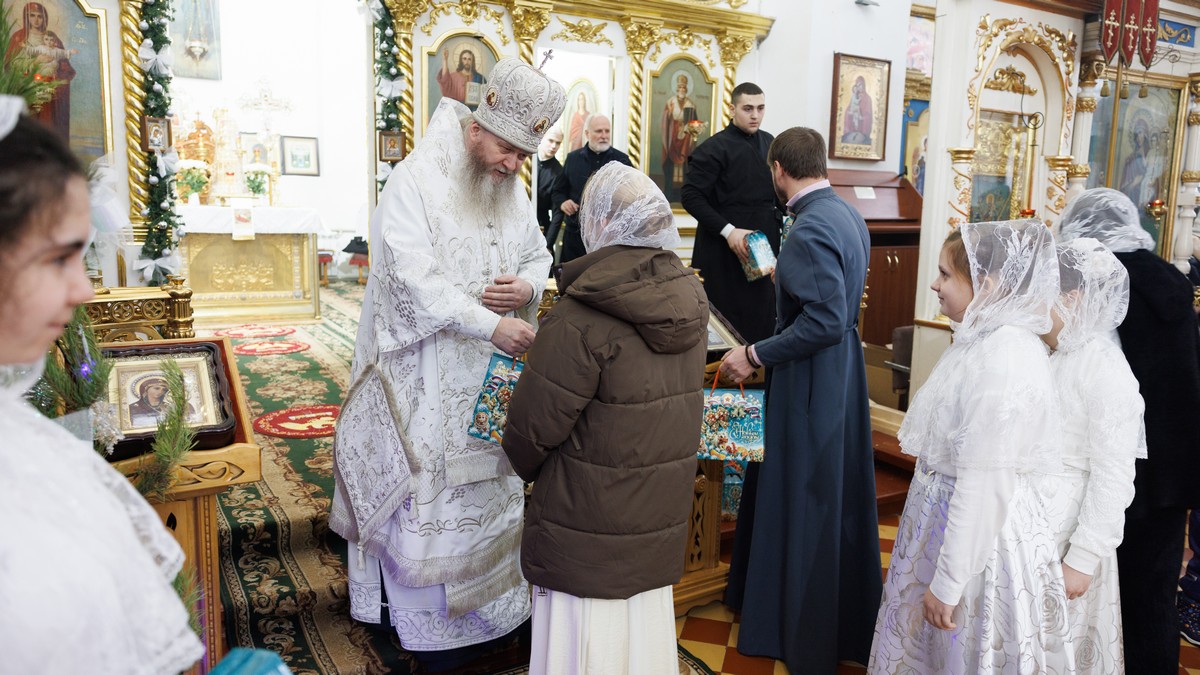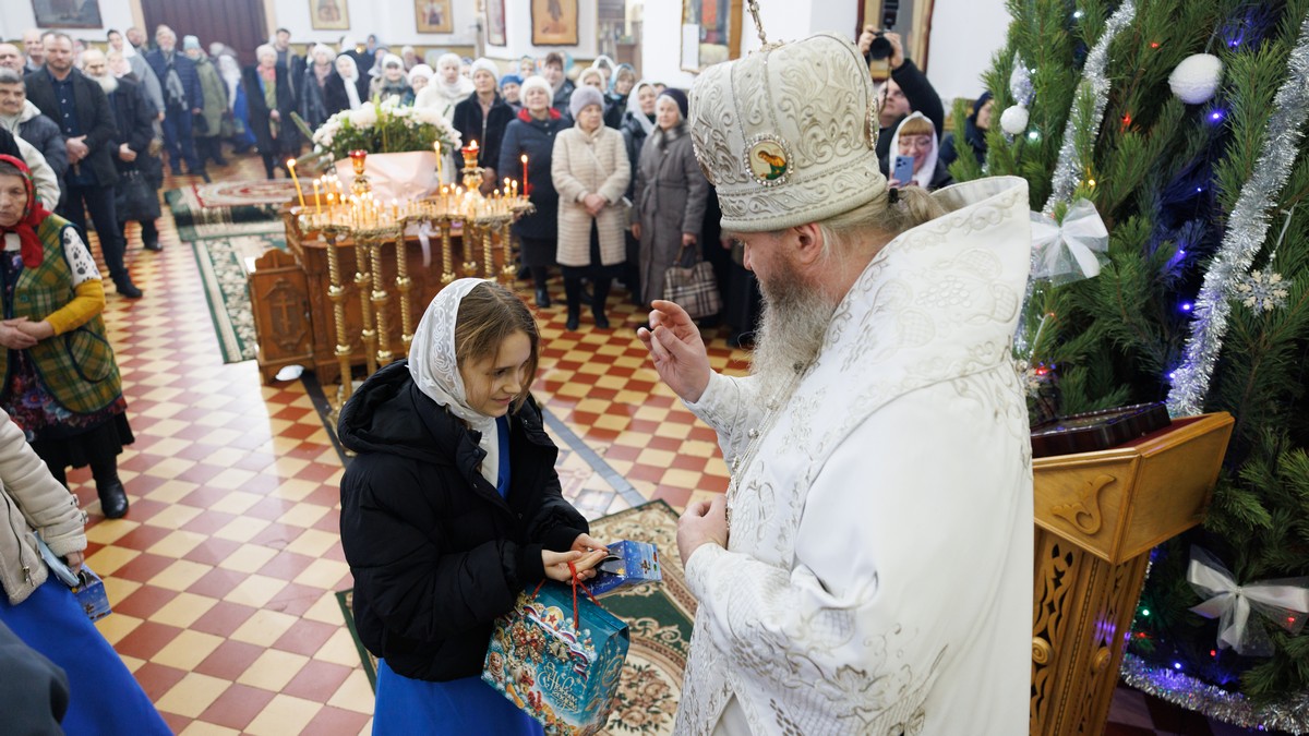 Поздравляя деток с Рождеством Христовым, владыка раздал им сладкие подарки.