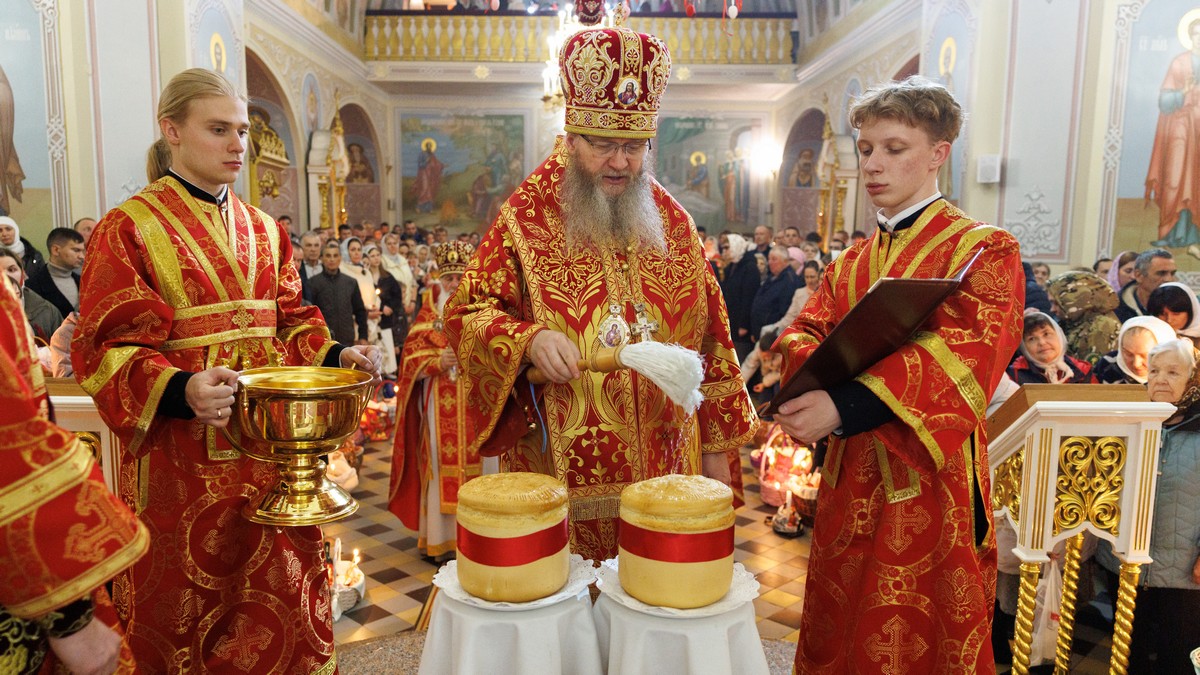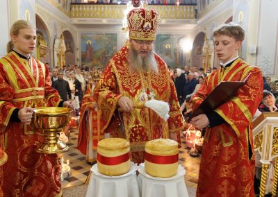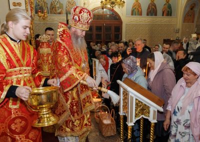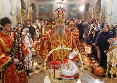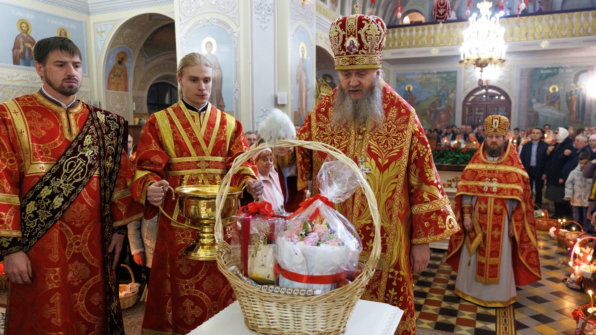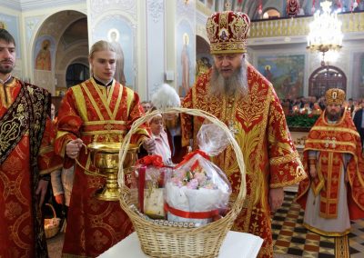 После заамвонной молитвы владыка освятил Артос, поздравил всех с Пасхой Христовой, а затем освятил пасхальные приношения.