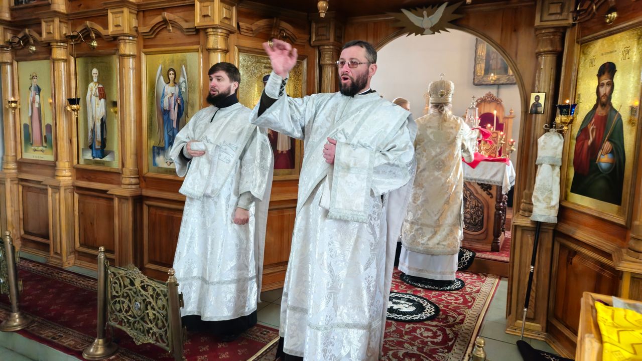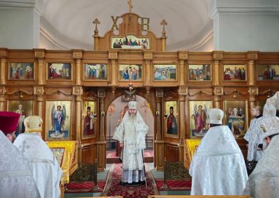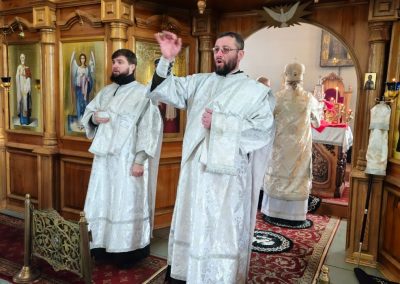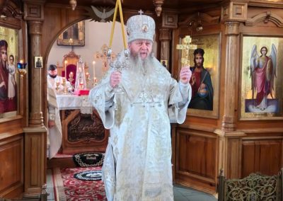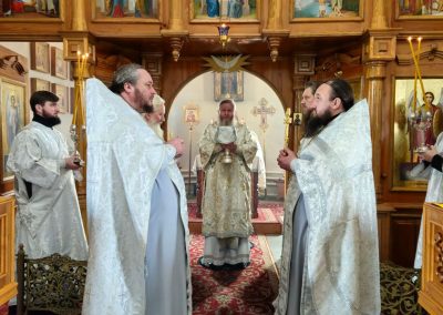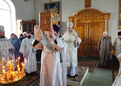 За богослужением Его Высокопреосвященству сослужили секретарь Епархии протоиерей Андрей Зозуля, благочинный Перевальского округа прот. Роман Колодка, а также духовенство благочиния. За богослужением молился благочинный Алчевского округа прот. Александр Устименко.