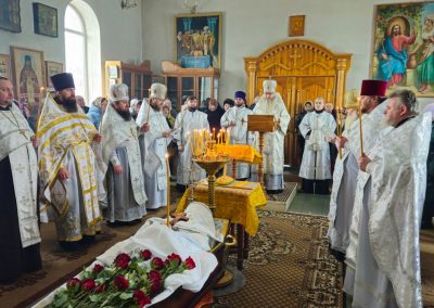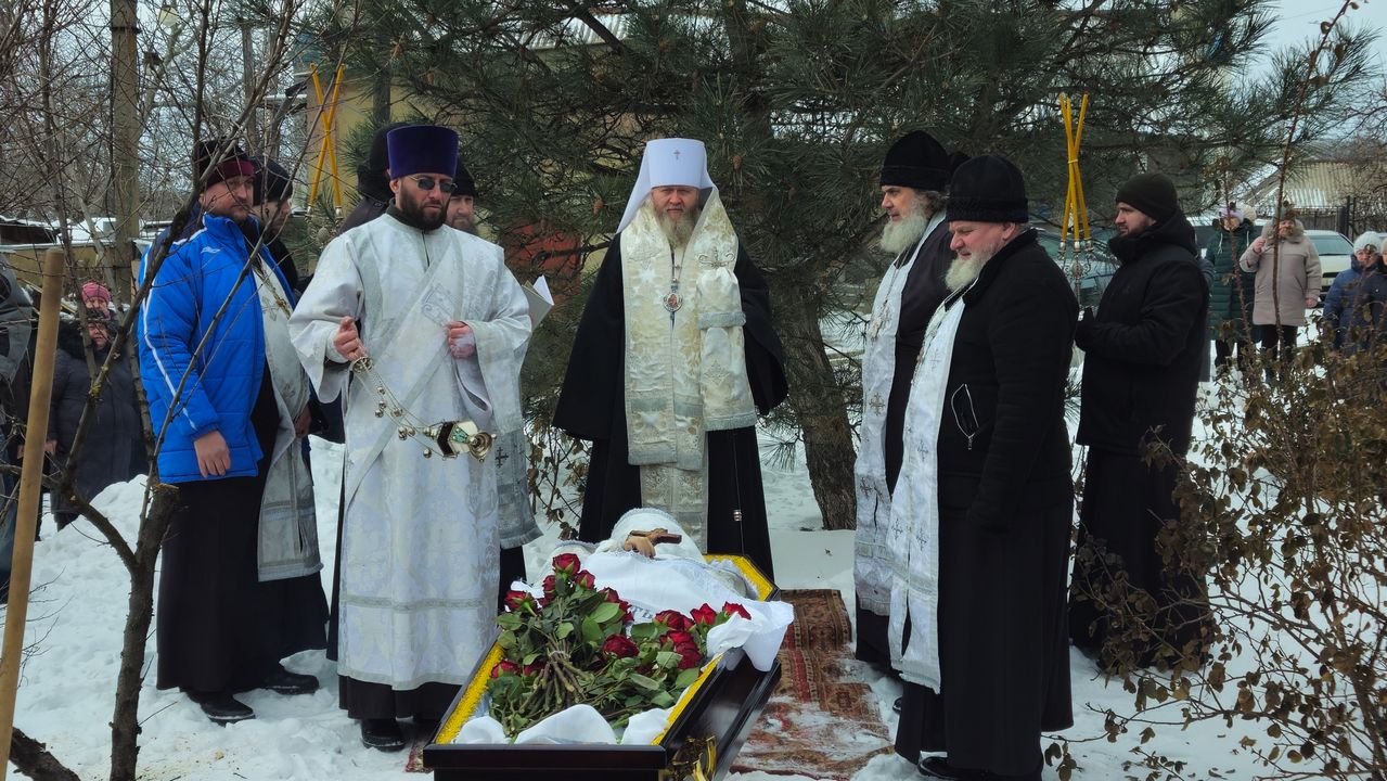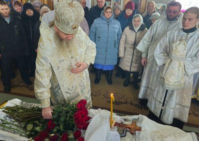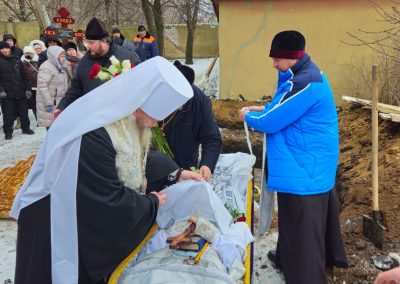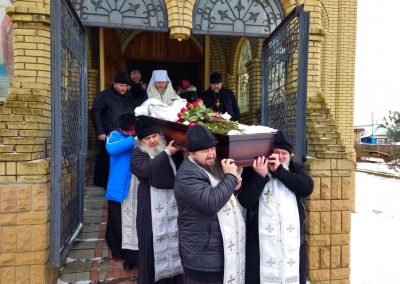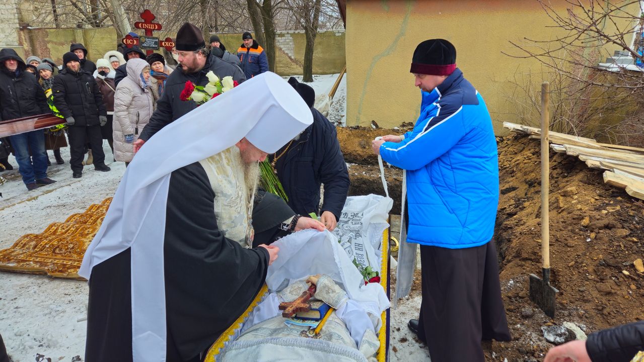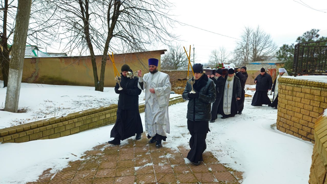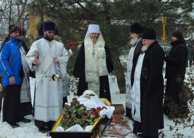 После чина отпевания владыка Пантелеимон выразил искренние слова соболезнования родным и близким почившего, и, следуя древней традиции, от лица усопшего трижды испросил прощения у всех присутствующих на заупокойном богослужении. Затем, в молитвенном молчании, гроб с телом отца провели в последний путь к месту упокоения на территории храма.