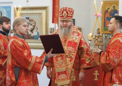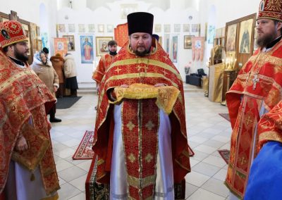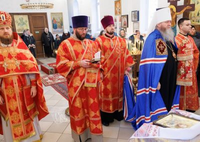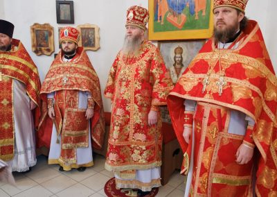 За Божественной литургией владыке сослужил секретарь Епархии прот. Андрей Зозуля, благочинный Станично-Луганского округа прот. Алексий Храбров, настоятель храма прот. Алексий Головко, а также приглашенное духовенство.