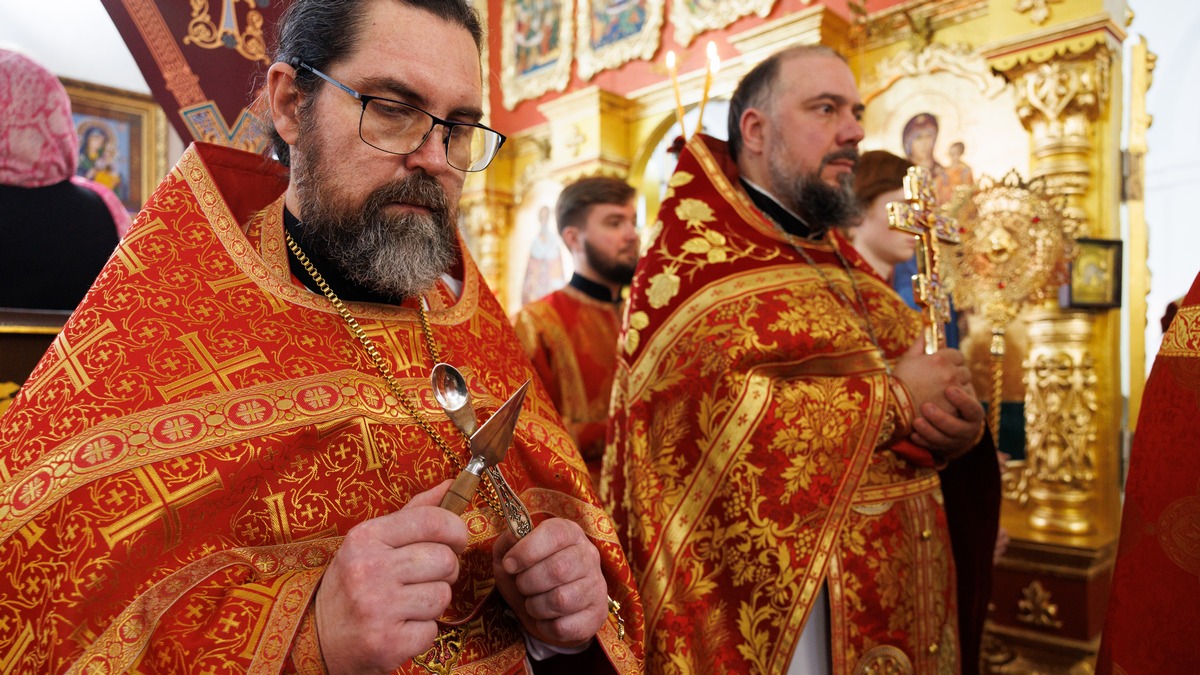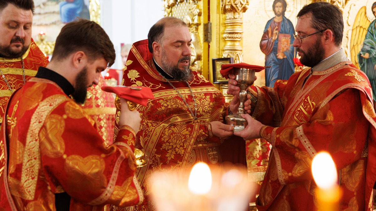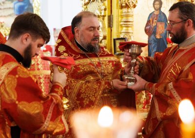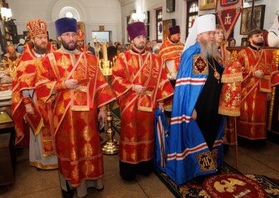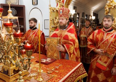 За Литургией Его Высокопреосвященству сослужил секретарь Епархии прот. Андрей Зозуля, и.о благочинного первого Луганского округа протоиерей Алексий Болдырев, настоятель храма протоиерей Олег Кислый и клирики прихода.