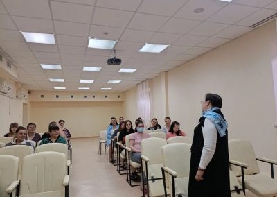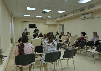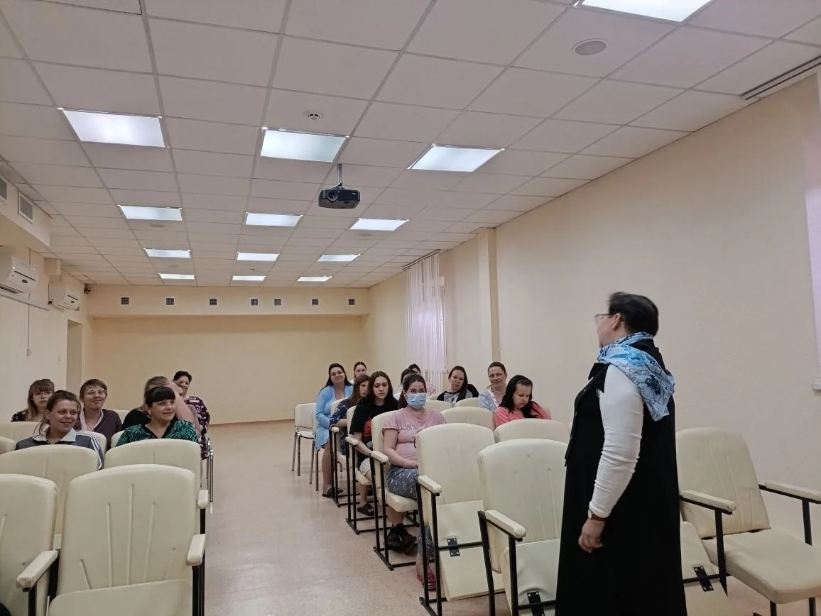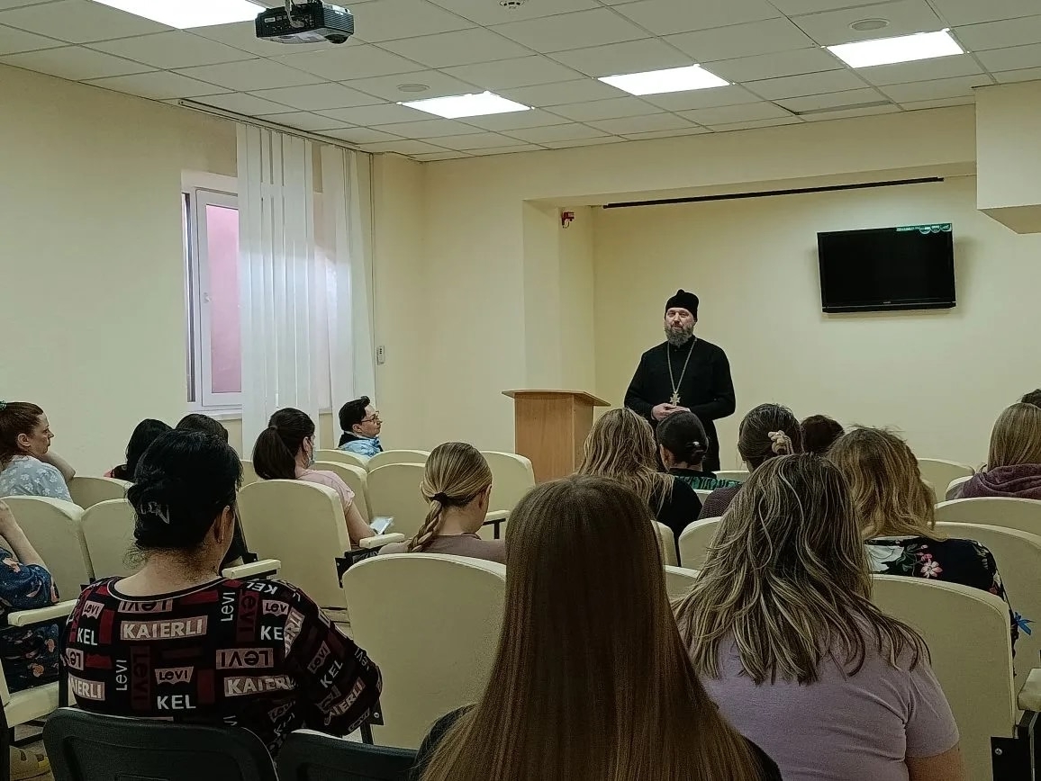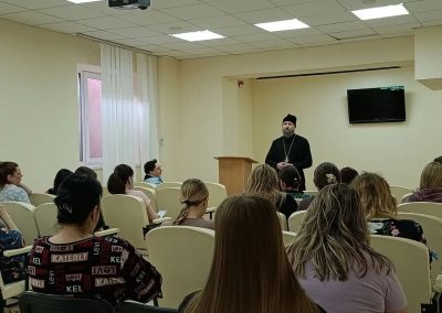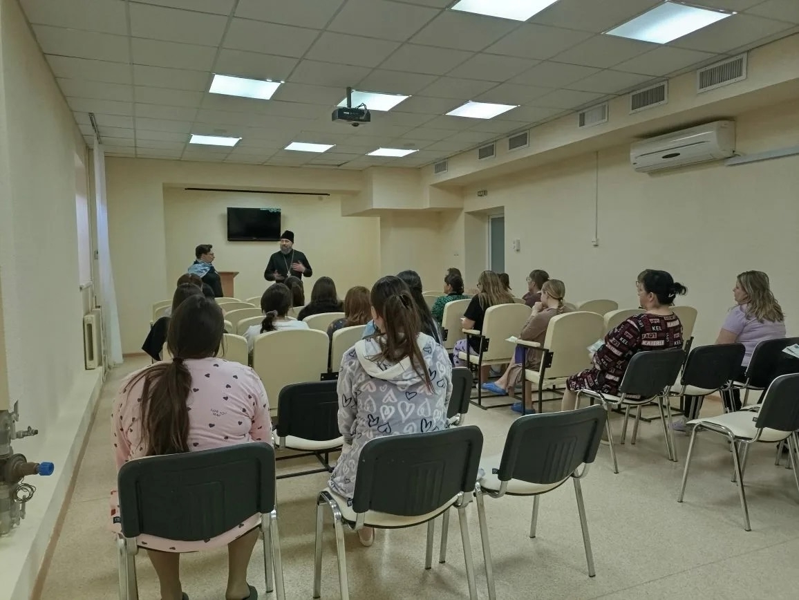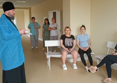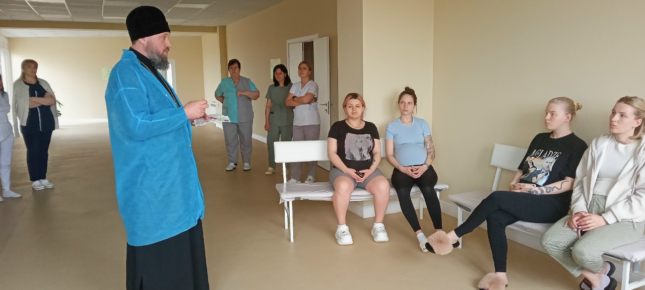 На встречах с беременными, отец Димитрий кратко рассказал об истории праздника Благовещение Пресвятой Богородицы, о важности духовной составляющей во время беременности, родов и возрастания младенца, ответил на вопросы о Таинстве Крещения, выборе имени новорожденному, о молитвенной поддержке роженицы и ребенка и преподал беременным священническое благословение. Каждой мамочке были вручены информационные буклеты о православных традициях подготовки к родам, подготовленные епархиальным миссионерским отделом совместно с СПЖ ЛНР.