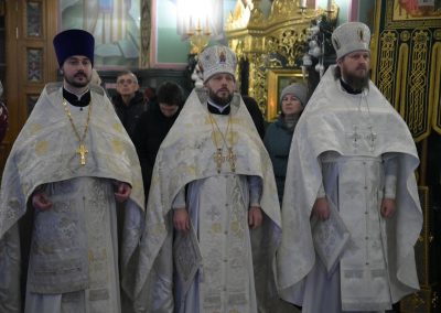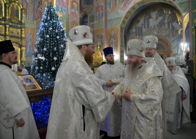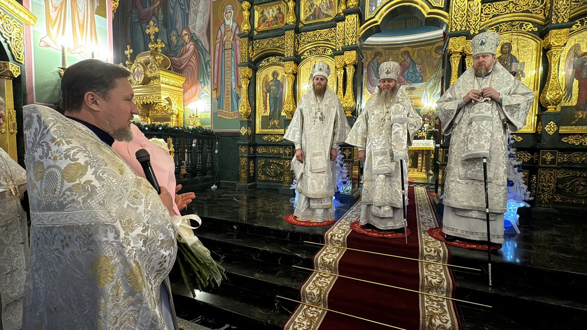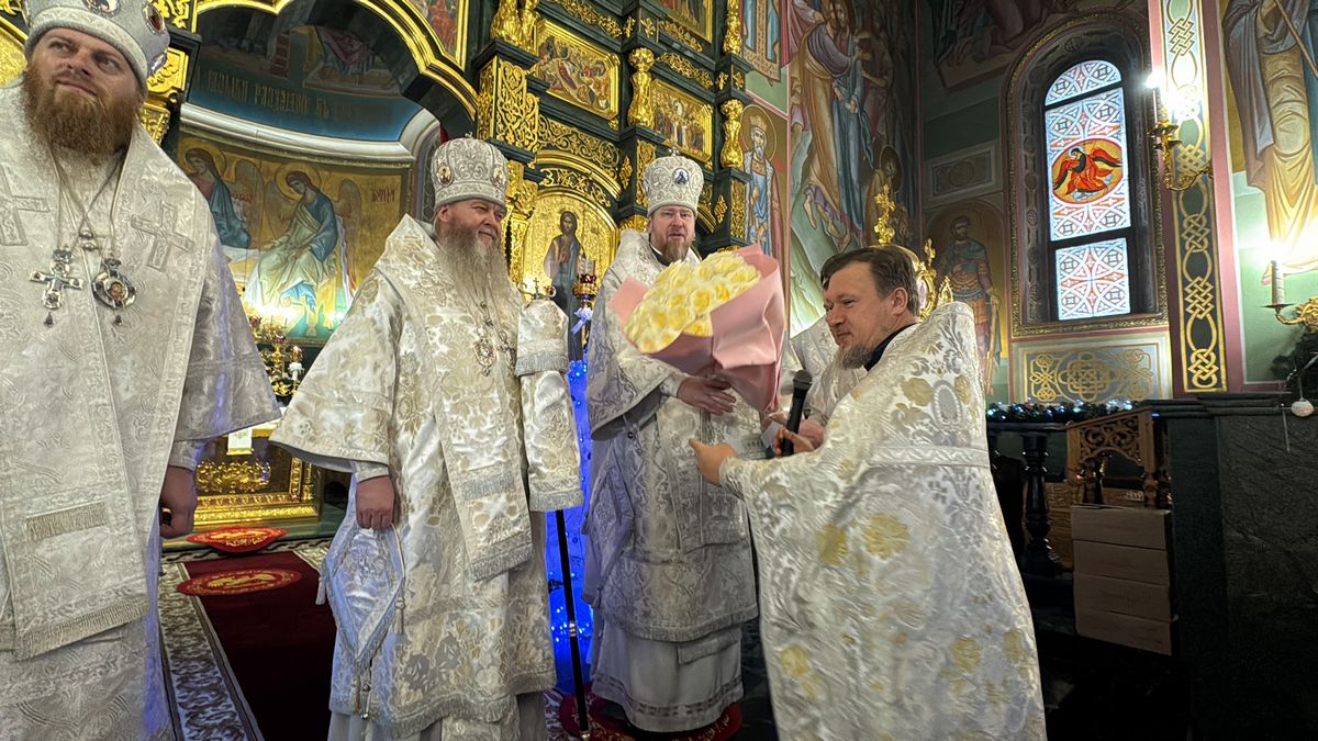 По окончании богослужения к архипастырям от лица клира и прихожан собора обратился протоиерей Димитрий Чеверда. Отец благочинный выразил общую радость от совместной молитвы с тремя архиереями в святочные дни. Он также поделился впечатлениями от Большого Рождественского концерта, прошедшего накануне в «Донбасс Опере», поблагодарив митрополита Владимира за организацию этого значимого для всего края события. В знак глубокого уважения и благодарности владыкам были преподнесены букеты белых роз.
