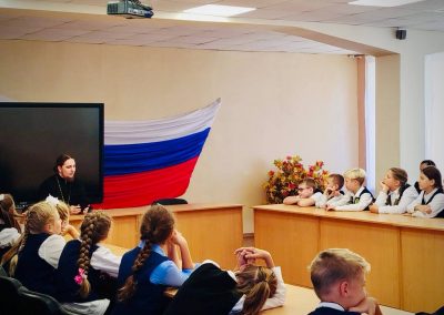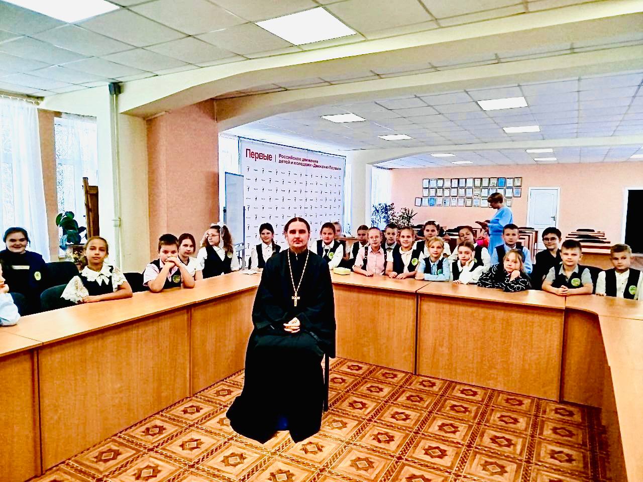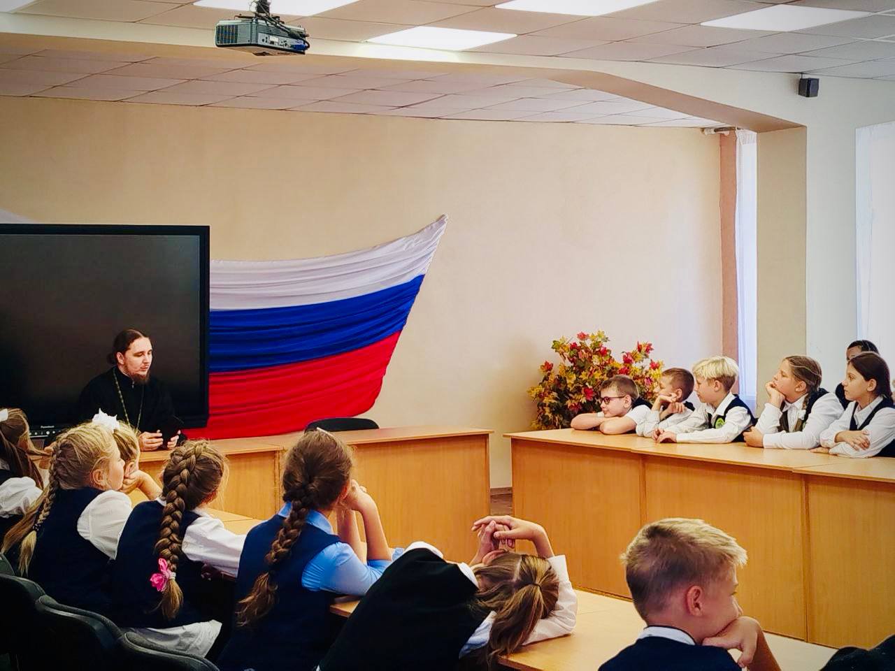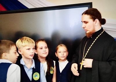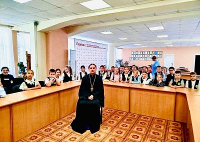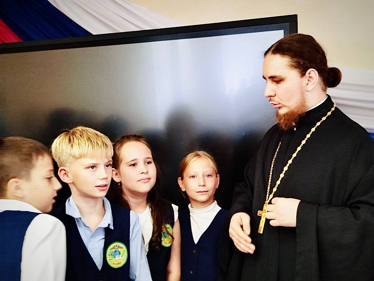 16 сентября, по приглашению преподавателя Основ Православной культуры школы «ЛУВК-ИНТЕЛЛЕКТ» Мошук Аллы Ивановны, состоялась встреча клирика храма блаженной Ксении Петербургской, города Луганска иерея Василия Демчика и учащихся трёх 4-тых классов.
