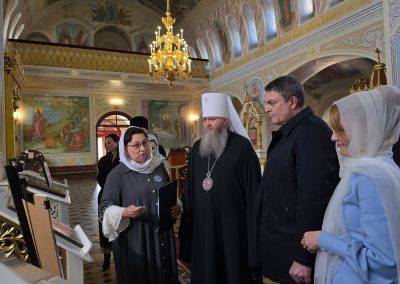 Гостям были представлены храмовые аналойные иконы, возвращенные в Луганск после их реставрации во Владимирском государственном университете имени Александра Григорьевича и Николая Григорьевича Столетовых. Краткую экскурсию около святынь об истории их обретения и восстановления, по благословению владыки Пантелеимона, провела председатель Регионального отделения Международной общественной организации «Союз православных женщин» в ЛНР Наталья Сергеевна Кузнецова. Она отметила, что реставрация представленных икон проходила в рамках гуманитарной инициативы по сохранению духовного и культурного наследия Донбасса, запущенной сенаторами Дарьей Лантратовой (от Луганской Народной Республики) и Андреем Шохиным (от Владимирской области) в августе 2025 года. Реликвии передали во Владимирский государственный университет по благословению Высокопреосвященнейшего Пантелеимона, митрополита Луганского и Алчевского, где под руководством заслуженного художника России Светланы Красулиной были проведены реставрационные работы. Всего в Луганск вернулись шесть храмовых аналойных икон с образами Спаса Вседержителя, святителя Николая Чудотворца, трёх вселенских святителей — Василия Великого, Григория Богослова и Иоанна Златоуста, святых апостолов Петра и Павла, пророка Илии, великомученицы Екатерины, преподобного Михаила Малеина. На момент передачи они находились в аварийном состоянии, но благодаря усилиям специалистов были бережно восстановлены.